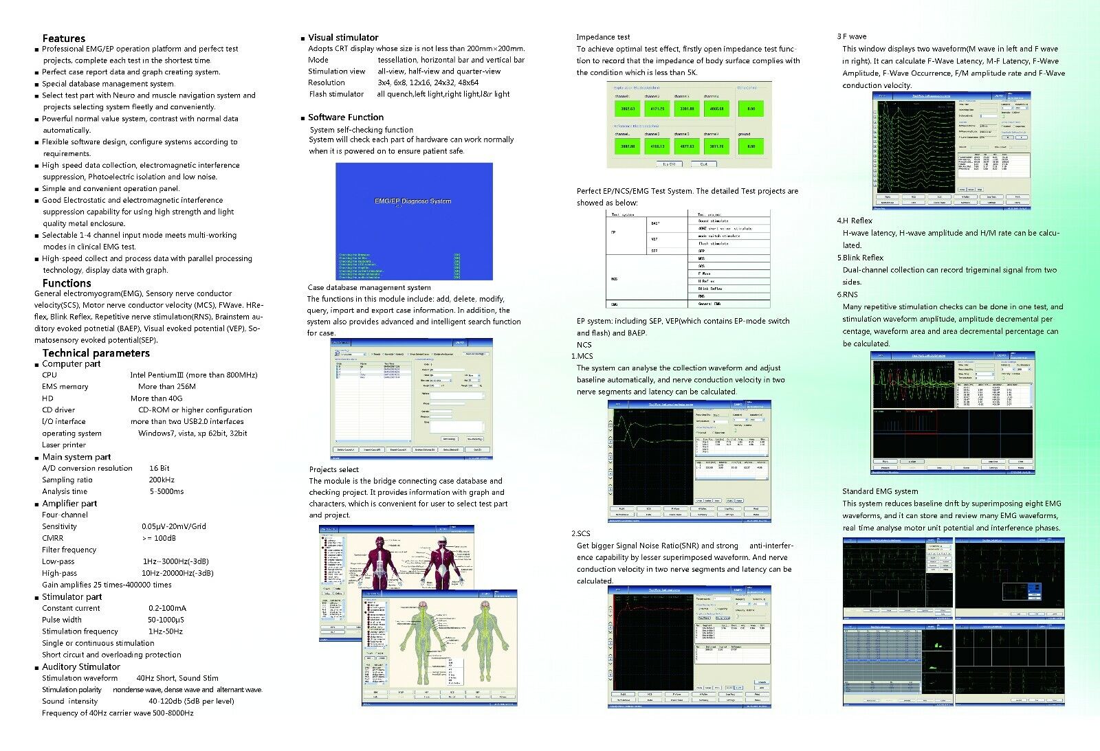 CMS6600B EMG/EP System (PRODOTTO NUOVO)L’apparecchiatura registra l’attività bioelettrica del muscolo nervoso perdeterminarne lo stato funzionale, che si combina con la velocità diconduzione nervosa, per fornire al paziente una diagnosi ausiliaria.Controllo dei contenuti: EMG (elettromigramma), MCS (velocità delconduttore nervoso motorio), SCS (velocità del conduttore nervososensoriale), onda F, riflesso H, RNS (stimolazione nervosa ripetitiva),riflesso dell’ammiccamento, VEP (potenziale evocato visivo), BAEP(tronco cerebrale uditivo potenziali evocati), SEP (potenziali evocatisomatosensoriali), ecc
